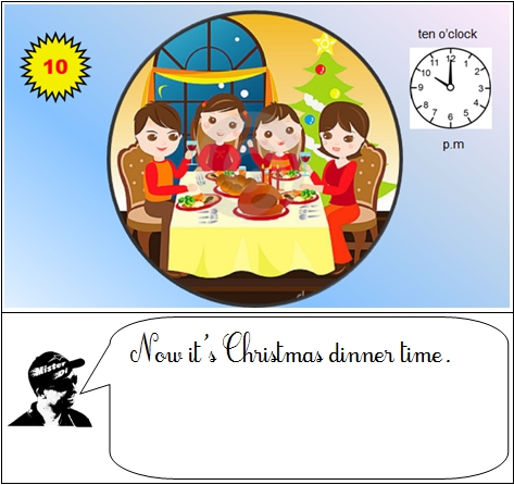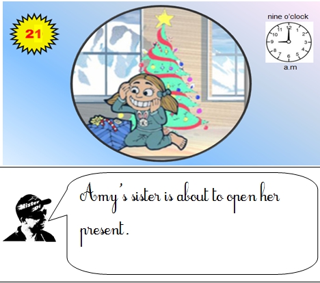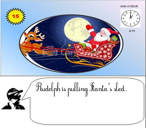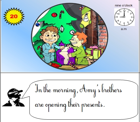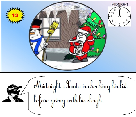 Voici les phrases de l'histoire " Christmas Story"' que Misterdi a demandé à ses élèves d'apprendre par coeur. Chaque élève de la classe doit enregistrer, apprendre, mémoriser, répéter, retenir par coeur. Quand chaque élève aura retenu sa phrase et se sera bien entraîné, Misterdi filmera en classe tous les élèves à la suite en train de réciter, chacun à leur tour l'histoire devant l'écran vidéo où sera diffusée l'image sans le texte.